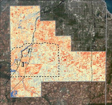^ NDVI analysis of Will County, IL, in Aug 2020, highlighting man-made constrution, warehousing, and agricultural land use in the region for Remote Sensing I. Areas shaded red are high-leafy-green vegetation areas, and the pale green and yellow indicates farmland and some prairie. The dashed region is a study area for increased truck traffic, environmental hazards and pollution.